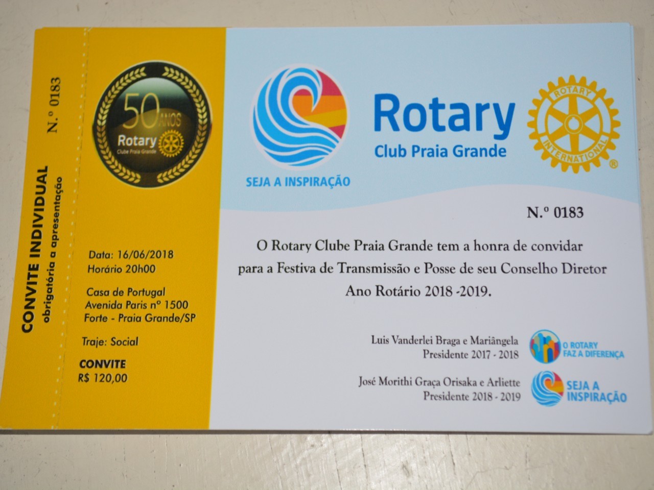 O Rotary Club de Praia Grande tem a honra de convidar para a Festiva de Transmissão e Posse de seu Conselho Diretor dia 16/06/2018 que sera realizado na Casa de Portugal Avenida Paris nº 1500 Forte-Praia Grande SP.