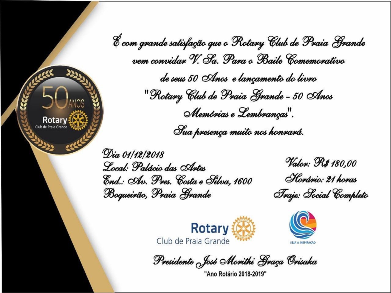 É com grande satisfação que o Rotary Club de Praia Grande vem convidar V. Sª. P. O baile comemorativo de seus 50 anos e lançamento do livro.
